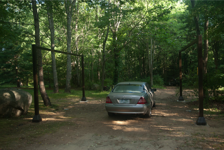 RP2 GateGuard platform uses a five channel MP and provides high security detection of exit/entry of human ID and RuBee enabled assets in a moving vehicle. GateGuard has five antennas placed inside four vertical poles, and buried under the road. GateGuard can discover up to five ID tags, legal assets, and hidden assets within a vehicle moving at 5 Km/Hr. Mouse over to see antennas. The red lines indicate five antennas in this GateGuard installation.